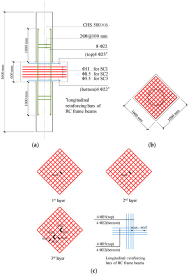 The Series I axial compression tests included three geometrically identical full-scale specimens, namely SC1, SC2, and SC3, and were designed with various rebar diameters of the steel meshes in the joints. Each specimen included the upper and lower CFST columns and the joint, as shown in Figure 2, while the slab and the RC beams were not fabricated because of the size limitation of the testing machine. Note that the longitudinal reinforcements of the RC frame beams were still arranged in the joint. Figure 3 and Table 1 report the geometric dimensions and reinforcements of each part of the specimens. Specifically, the longitudinal reinforcements of the column were inserted through the joint area with the anchorage lengths of 1000 mm in the CFST columns, as determined based on the Chinese building code [16]. To avoid the compressive stress concentrating at the end of the steel tube, a steel ring whose width and thickness were 18 mm and 6 mm, respectively, was welded to each end of the steel tubes. Five layers of steel meshes with the adjacent distance of 75 mm were arranged in the joint area. The diameters of the rebars in the steel meshes were 11 mm, 8.5 mm and 5.5 mm for specimens SC1, SC2 and SC3, respectively, as shown in Figure 3.