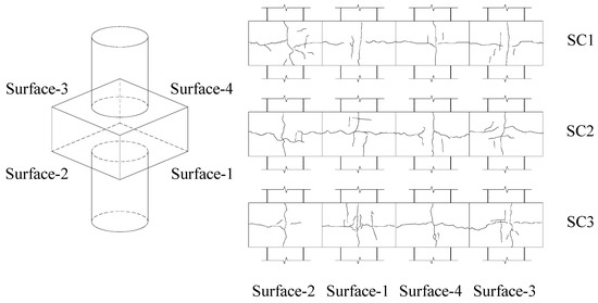 Regarding the crack pattern of Mode I, several vertical penetrating cracks can be found on the surfaces of the joint. The horizontal cracks may appear on the surfaces of the joint, but they were not penetrating (Figure 14). The specimens with the height factor β of 0.6 were categorised as the crack pattern of Mode I. Taking specimen C30-L2-H1-S2 as an example to describe the experimental observation in detail, the first vertical crack appeared when the upper load reached 800 kN. The crack extended gradually and became a penetrating crack when the load reached 1200 kN. The steel meshes started to reach the yield strains as the load increased to about 4000 kN. After that, the specimen reached its maximum load-carrying capacity of 7800 kN. During the post-peak loading stage, the concretes began to spall and crush. The test was terminated when the bearing capacity of the specimen declined to 85% of its peak load.