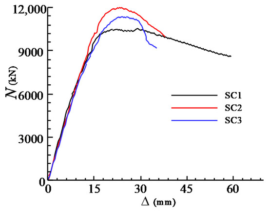 Taken specimen SC2 as an example to illustrate the experimental observation in detail, when the load reached about 45% of Nu (Nu is the peak load of the specimen, for SC2 Nu = 12,004 kN), the first crack was found at the middle of the side surface of the joint in the vertical direction. As the load increased to about 50% of Nu, the vertical crack developed with a maximum width of about 0.1 mm, and a short horizontal crack occurred on the side surface of the concrete at the same time. At about 70% of Nu, the maximum widths of the vertical and horizontal cracks on the side surface of the joint reached 0.25 mm and 0.15 mm, respectively. When the specimen reached its maximum load Nu, dilation and local buckling of the steel tubes of the CFST columns were observed. At the post-peak loading stage, the steel tubes of the CFST columns continued to dilate with the load capacity of the specimen gradually dropped to about 85% Nu.