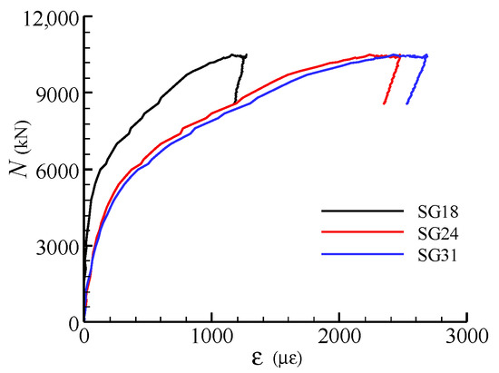 Figure 8 shows the load-strain curves for the steel meshes at different layers in specimen SC1. The strain gauges were arranged at the centre of the cross-section of the joints (see Figure 3). It can be seen that the strains in the steel meshes at the mid-height of the joint are larger than those in the upper and lower layers. Besides, the steel meshes reach their tensile yield strains at the peak load except the one located in the first layer (SG18).