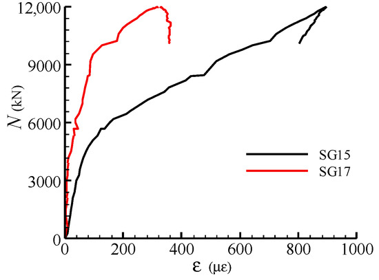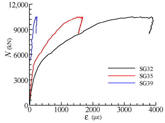 Figure 9 shows the load-strain curves for the steel mesh at the third layer with different plan positions in specimen SC1. It can be observed that the strains which are closer to the central section exhibit more serious tensile deformation. In addition, the steel meshes suffered from small compressive strain at the outermost positions (SG32) in the early loading stage.