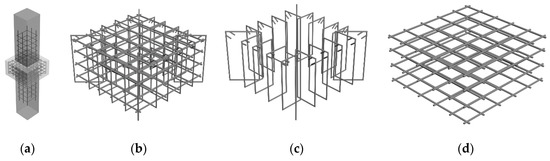 Recently, through-beam joints connecting the CFST columns and RC beams have attracted the interest of researchers because of their simple detailing in the joint area, with a brief review of the recently developed through-beam joints summarised herein. Nie et al. [8] and Bai et al. [9] developed a representative through-beam joint connecting the concrete encased CFST columns and RC beams, where the steel tubes of the CFST columns were completely interrupted in the joint area, and the steel-reinforcement bars in the RC beams were continuous in the floor. Zhang et al. [10] developed a through-beam joint for concrete-filled double-skin steel tubes structural members, where the outer tube was interrupted in the joint area and an octagonal RC ring beam was arranged outside the joint to connect the reinforcements from the RC beams. Chen et al. [11,12] reported a new type of through-beam connection for CFST columns and RC beams, where the steel tube of the CFST column is completely or partially interrupted, and a ring beam was used to strengthen the load-carrying capacity of the joint. Zhou et al. [13,14] proposed a tubed-reinforced-concrete column to RC beam joint, where the steel tubes are completely interrupted in the joint area, with different manners to strengthen the joint, including the strengthening stirrup, horizontal hunches, and internal diaphragm. The seismic behaviour of the aforementioned through-beam joints was examined through cyclic loading tests. It was generally found that the through-beam joints are capable of achieving the design criterion of ‘strong joint-weak member’ with excellent seismic performance. Provided that the steel tubes of the CFST columns were generally interrupted at the joint area, axial compressive tests on the through-beam joints were also conducted by Nie et al. [8], Bai et al. [9], Chen et al. [11] and Zhou et al. [13], to investigate the axial compressive strengths of the joints; it was found that the strengths of the joints were higher than those of the corresponding CFST columns, and thus the design criterion of the ‘strong joint-weak member’ was deemed to be achieved. Recently, an innovative joint connecting the square CFST columns and RC beams has been developed by the authors [15]. The configuration and detailing of the innovative joint are displayed in Figure 1, where the outer steel tube was completely interrupted in the joint zone, and the longitudinal reinforcements from the RC beams could easily pass through the joint area. A reinforcement cage, including a series of reinforcement meshes and radial stirrups, was arranged in the joint area to strengthen the mechanical performance of the joint because of the interruption of the steel tube. The benefits of the proposed configuration of the innovative joints over the existing through-column and through-column beam joints include (i) the reinforcements from both structural columns and beams could easily pass through the joint area, ensuring both robustness and integrity of the joints, and (ii) the reinforcement cage in the joint can be precast and on-site welding is not required, leading to a simplified construction process. Cyclic loading tests on the innovative joints have been conducted by the authors [15] to study their seismic behaviour, while the axial compression behaviour of the innovative joints subjected to bearing loads remained unexplored and will be studied in the present paper.