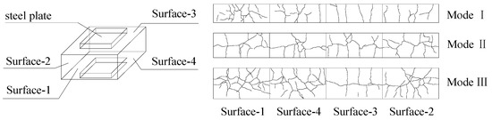 Table 5 summarises the key experimental observations, including the loads corresponding to the appearance of the first crack Ncr, the loads when the maximum crack width developed to 0.2 mm N0.2 and the loads when the maximum crack width developed to 0.3 mm N0.3. It can be concluded that all the specimens had similar performance during the tests, with cracking of the concrete, yielding of the steel meshes and eventual spalling and crushing of the concrete. At the ultimate loads, several vertical penetrating cracks occurred on the surface of the joint. However, the distributions of the horizontal cracks were different with various height factor β. Accordingly, three different crack patterns (i.e., Mode I, Mode II and Mode III) on the surface of the specimens can be classified according to the distributions of the horizontal cracks, as shown in Figure 14. As the height factor β increases from 0.6 to 1.0, the horizontal cracks begin to generate, and the number of horizontal penetrating cracks gradually rises. The crack pattern modes of all the 14 specimens are summarised in Table 5.