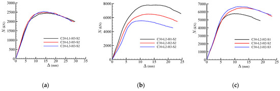 Axial load (N) verse displacement (Δ) relationships (a) Series C20 H3 S2; (b) Series C30 L2 S2; (c) Series C30 L2 H2.
