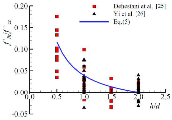 Existing experimental results have demonstrated that the height factor β is a critical factor affecting the ultimate strength of the joint [11,20]. With the height of the specimen increasing, the ultimate strength of the specimen declined rapidly, as evident in Section 3.4. The reason for the height effect of concrete can be explained by the friction generated at the surface between the steel plates and the concretes. The friction gradually transferred from the contact surface to the mid-height cross-section of the specimen, which plays a role of confinement and thus strengthens the compressive strength of the concrete. In order to quantify the degree of confinement at the mid-height cross section of the joint due to the friction effect, a regression analysis was conducted, based on the existing experimental results on the height effect of plain concrete. First, a total of 99 experimental data on the height effect of concrete were collected from the existing experiments carried out by Dehestani et al. [26] and Yi et al. [27]. The lateral pressure for the height effect of each data can then be derived by substituting the corresponding unconfined concrete strengths and the confine concrete strengths into Equation (2). The ratio of for each data was plotted against the corresponding h/d ratio and displayed in Figure 18, in which d is the width of the local compression zone. As shown in Figure 18, the increase of h/d ratio results in a downtrend of and the regression equation of lateral pressure for the height effect of concrete can be obtained and given by Equation (5).