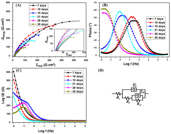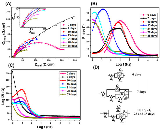 Figure 2D represents the equivalent circuits of the fitted EIS data. Rs represents the resistance of electrolyte, Qf is the constant phase element (CPE) at the film/solution interface, Rf exemplify the pore film resistance, Qdl is the CPE of coupon/solution interface, Rct is the charge transfer resistance at the coupon/solution interface, and W represent Warburg impedance elements. Both circuits have constant phase elements (Qf) instead of the ideal electrical double layer capacitors. This was attributed to the surface roughness, inhomogeneous reaction rates distribution, non-uniform thickness, non-uniform composition of the double layer, and/or non-uniform current distribution [61,62,63,64,65]. Since the SRB biofilm provides a more prominent effect during the initial days of incubation, an additional element W is used in the equivalent circuit, corresponding to the diffusion controlled electrochemical process as a result of the complete biofilm formation [59]. As the incubation time increases, the biofilm starts to degrade so the mass transfer is not the controlling factor anymore, so W is removed from the equivalent circuit.