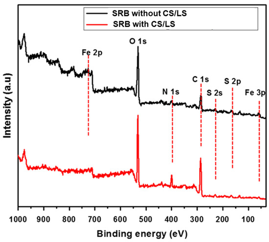 Figure 5 shows the XPS survey of corrosion products after 35 days in SRB media with and without 500 µg·mL−1 of CS/LS. SRB induced biocorrosion follows the sulfate reduction pathway at the metal surface with the help of a hydrogen intermediate [70]. This sulfide can appear as H2S, HS− ions, S2− ions or metal sulfides, according to the different conditions which build up at the metal surface and catalyze the corrosion process [71]. As a result, the Fe is oxidized to Fe2+ and sulfate is reduced to sulfide followed by the formation of FeS. The overall reaction can be written as: