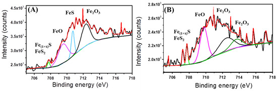 The fitted Fe 2p peaks after 35 days with and without CS/LS are shown in Figure 6A,B respectively. Two sharp peaks at 709.6 eV and 707.6 eV (Fe 2p3/2) corresponding to FeO (pink curve) and mackinawite (Fe1+xS) (green curve), respectively. Pyrite (FeS2) is present in both spectra (green curve) [50]. In addition, a peek at around 712.4 eV corresponds to Fe3+ (originated from Fe2O3) is present in both the coupons (black curve) [72]. A sharp peak at around 710.4 eV (Fe 2p3/2) corresponding to FeS (cyan curve) is present in the coupon exposed to SRB alone [73]. The peak at 713.7 eV of (Fe 2p3/2) corresponds to Fe(III)O from Fe2O3 and is found in presence of CS/LS [74]. From the XPS analysis, the corrosion products are mostly FeO, FeS, FeS2, and Fe2O3. However, FeS peak is prominent only in the coupon exposed to SRB alone which confirmed the reduction in SRB activity in the presence of CS/LS.