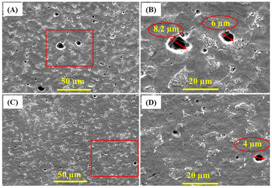 SEM micrograph of corrosion pits after removing the corrosion products from SS400 coupons incubated in SRB alone (A,B) and in presence of CS/LS nanospheres (C,D) after 35 days of incubation.
