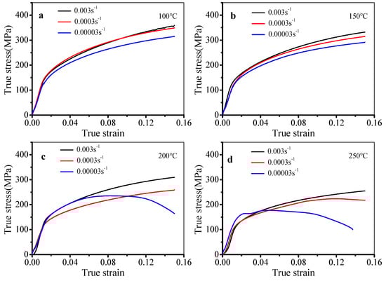 The flow stress curves of the stretched alloy are displayed in Figure 2. The stretched process can be divided into the elastic and plastic deformation stages. In the elastic deformation stage, the true stress linearly rises with the true strain. This is because dislocations quickly accumulate in material. Meanwhile, the rearrangement and annihilation of dislocations are low because of the short deformation time [26,27]. However, in the plastic deformation stage, the slope of the flow stress curve gradually decreases with increased strain. The reason is that the work hardening (WH) gradually weakens, while the dynamic softening is gradually enhanced [28,29]. In Figure 2a,b, the true stress gradually rises with the increased true strain at 100 °C and 150 °C. This is because WH is dominant, but the role of dynamic softening is relatively low at low temperatures [30,31]. In Figure 2c, as the temperature is raised to 200 °C, the true stress still rises with the raised true strain at 0.003 s−1 and 0.0003 s−1. However, it firstly increases and then keeps stable, finally rapidly dropping with the increase in strain at 0.00003 s−1, i.e., the dynamic softening is enhanced. In Figure 2d, as the temperature is further increased to 250 °C, the true stress increases with the increase in strain at 0.003 s−1. The true stress firstly rises and then keeps stable at 0.0003 s−1. However, obvious dynamic softening behavior is observed at 0.00003 s−1. In general, the true stress is affected by strain rate and temperature. The true stress declines with the increased temperature. The reason is that the thermal motion of atoms is enhanced, which decreases the bonding force of atoms, and plastic deformation easily occurs [25,32,33]. Thus, the role of dynamic softening is more obvious at higher temperatures. In addition, the true stress drops with the decreased strain rate, because the deformation time is enough at low strain rates, enhancing the annihilation and rearrangement of dislocations [34,35]. Then, the true stress drops with decreasing strain rate.