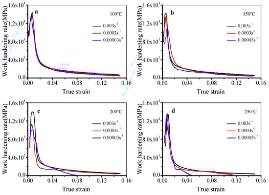 Work hardening rate–true strain curves at (a) 100 °C, (b) 150 °C, (c) 200 °C, and (d) 250 °C.
