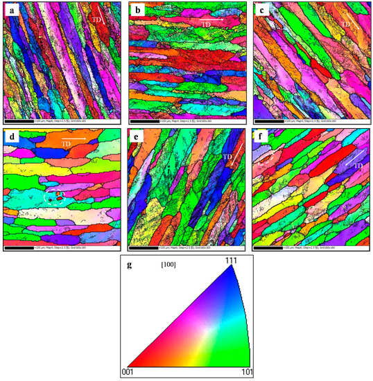 The inverse pole figure (IPF) maps of the stretched alloy at tested conditions are displayed in Figure 4. The grains are elongated along the tensile direction (TD) at different temperatures, as depicted in Figure 4a–d. The degree of grain elongation decreases with the raised temperature, i.e., the maximum grain elongation changes from 432 μm to 321 μm while the temperature is raised from 100 °C to 250 °C. Furthermore, substructures can be observed in Figure 4. The grain boundaries of substructures are low-angle grain boundaries (LAGBs). Here, the misorientation angles with 0° < θ < 15° and θ > 15° are referred to as LAGBs and high-angle grain boundaries (HAGBs), respectively. Meanwhile, the number of substructures decreases with the raised temperature. In addition, small fine grains around the elongated original coarse grains can be observed at 250 °C, which are marked with the white dotted line region in Figure 4d. The grain boundaries of these grains are HAGBs. Generally, LAGBs are formed by dynamic recovery (DRV), while HAGBs are formed by dynamic recrystallization (DRX) [36,37]. DRX grains are formed due to the rotation of small substructures [38,39]. This is consistent with those findings of other scholars [40,41]. In Figure 4e–f, the degree of grain elongation and the number of substructures decrease while the strain rate decreases from 0.003 s−1 to 0.00003 s−1. Additionally, some DRX grains can be found at 0.00003 s−1 in Figure 4f.