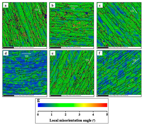 The kernel average misorientation (KAM) maps in the tested conditions are displayed in Figure 6. The values of KAM from 0° to 5° are marked as colors from blue to red. A large KAM value means a high geometrically necessary dislocation density [43,44]. In Figure 6a–c, it can be found that there are many green regions at different temperatures. Based on statistical analysis, the KAM values (mean local misorientation angle) are 2.00°, 1.77°, and 1.59°, respectively, at 100, 150, and 200 °C. When the temperature is raised to 250 °C, the dominant grains are blue color, and the value of KAM drops to 0.82°. The KAM maps of the stretched alloy at different strain rates are depicted in Figure 4e–f. As the strain rate decreases from 0.003 s−1 to 0.00003 s−1, the green regions decrease, and the value of KAM drops from 1.82° to 1.20°. The value of KAM is low at high temperatures or low strain rates, which reveals that the geometrically necessary dislocation density is low. This is because the DRV becomes more and more obvious, which accelerates the dislocation annihilation. Furthermore, the decreased substructures reduce the flow stress.