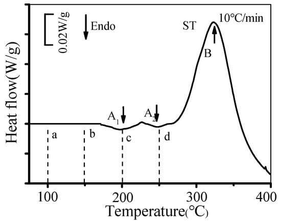Figure 7 shows the DSC curves of the solution-treated alloy. Theoretically, four endothermic peaks and four exothermic peaks can be found in the DSC curves. Furthermore, four endothermic peaks represent the dissolution of Cu-rich clusters, G.P. zones, θ′′ and θ′ phases, while four exothermic peaks reveal the precipitation of G.P. zones, θ′′, θ′, and θ phases [45]. However, in actual experiments, not all the peaks can be fully found from the DSC curve due to the effect of heating rate. Rodríguez-Veiga et al. [46] found that few peaks can be observed when the heating rate is slow. In the present experimental curves, three peaks can be observed. Peak A1 resulted from the dissolution of G.P. zones, while peak A2 was induced by the dissolution of θ′′ phases. Peak B is related to the precipitation of θ′ phases. Because of the annihilation and overlap of peaks, the dissolution peaks of Cu-rich clusters, as well as the precipitation peaks of G.P. zones and θ′′ phases, cannot be easily observed. The temperature ranges of the dissolution peak of Cu-rich clusters, the precipitation peak of G.P. zones, and the precipitation peak of θ′′ phases are 50–85 °C, 105–125 °C, and 175–190 °C, respectively. The four tested deformation temperatures (100, 150, 200, and 250 °C) correspond to the four positions (a, b, c, and d) marked in the curves. Cu-rich clusters and G.P. zones formed after the alloy were heated to 100 °C and 150 °C, respectively. θ′′ phases are presented in the matrix when the alloy was heated to 200 °C and 250 °C. Thus, the influences of heating process before deformation on the type of precipitates are significant. This is further discussed following the TEM observation.