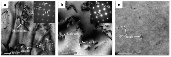 Figure 8 displays the TEM images and selected area electron diffraction (SAED) patterns of the heated alloy. Here, the heating rate is 10 °C/min, while the target temperatures are 150 °C and 250 °C. As depicted in Figure 8a, some dislocations can be found in the matrix at 150 °C. The Cu-rich clusters can be observed among dislocations. The SAED pattern reveals the continuous streaks along the {020}Al position. These are some main characteristics of G.P. zones formed during heating [47,48]. When the target temperature is 250 °C (Figure 8b), dislocations can still be seen in matrix. In addition, some needle-like precipitates appear in the matrix. In the high-multiple TEM images (Figure 8c), the length of these phases is around 10 nm, and the type of these phases is θ′′, which is further confirmed by the SAED pattern. Discontinuous streaks appear along {020}Al position, revealing the precipitation of θ′′ phases [49,50].