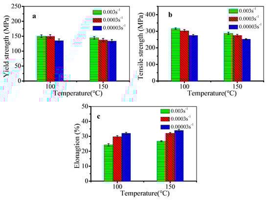 Figure 11 shows the mechanical properties of the stretched alloy at 100 °C and 150 °C. The mechanical properties are usually affected by dislocation density, as well as the type, size, and content of precipitates. Based on the above analysis, the size and content of precipitates are relatively small at 100 °C and 150 °C, which slightly influence the mechanical properties. Thus, the mechanical properties are mainly affected by dislocation density. With the increased temperature or the decreased strain rate, the dislocation multiplication and work hardening weaken, leading to the decreased yield strength (Figure 11a). From Figure 11b, the tensile strength drops with the decreased strain rate or the increased temperature. This is because the DRV is more obvious at lower strain rates or higher temperatures. Then, the dislocation density is decreased. In Figure 11c, the elongation increases with the raised temperature or the decreased strain rate, because the plastic deformation is more uniform due to the enhanced DRV.