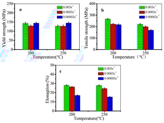 Mechanical properties of the stretched alloy at 200 °C and 250 °C: (a) yield strength; (b) tensile strength; (c) elongation.