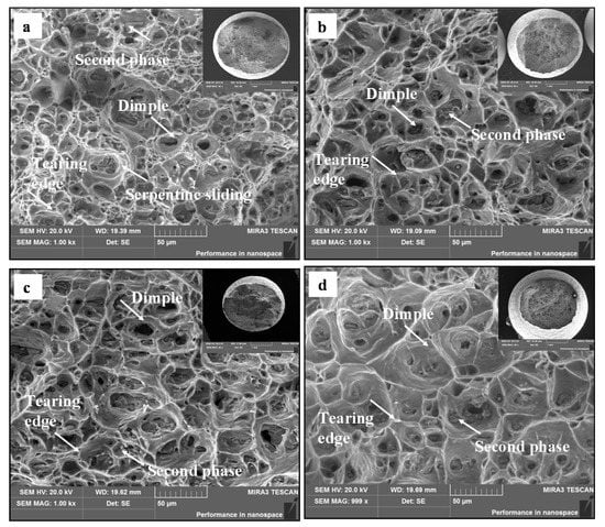 Figure 13 shows the fracture morphologies of samples. In Figure 13a, there are a lot of equiaxial dimples on the fracture surface, implying the shear fracture mode. The serpentine sliding and sharp tearing edges can be observed on dimple walls, i.e., the fracture mechanism is micro-void coalescence [54]. In addition, the second phase can also be seen at the bottom of the dimples. From Figure 13a–c, at 200 °C, the number and depth of dimples decrease with the decrease in stain rate. Meanwhile, the inhomogeneity of dimple sizes increases. This indicates that the plastic deformation is more uneven at a lower strain rate. Figure 13b,d shows the fracture morphologies at different temperatures when the strain rate is 0.0003 s−1. As the temperature is increased from 200 °C to 250 °C, the number of dimples decreases, and the inhomogeneity of dimple sizes increases. It can be concluded that the plastic deformation is more uneven with the increased temperature.