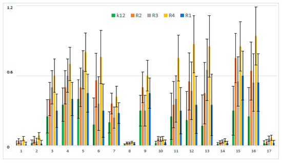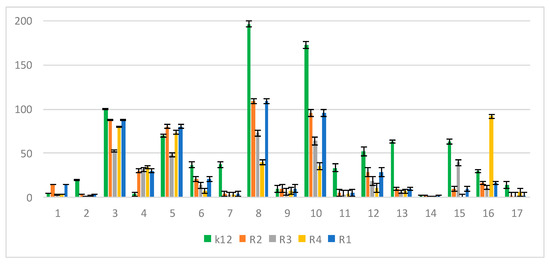 Minimum bactericidal concentration (MBC) of the peptidomimetics ratio for investigated strains of E. coli K12 as control (blue), R1 and R2 strains together (red; the values were almost the same), R3 strain (gray), and R4 strain (yellow). The x-axis features coumarin derivatives 1–17 used sequentially. The y-axis features the MBC value in mM. The order in which the compounds were applied to the plate was as described in Table 1.