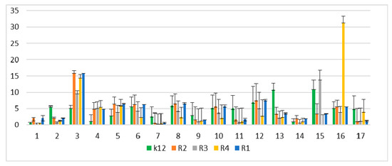 MBC/MIC of the peptidomimetics ratio for investigated strains of E. coli K12 as control (blue), R1 and R2 strains together (red; the values were almost the same), R3 strain (gray), and R4 strain (yellow). The x-axis features coumarin derivatives 1–17 used sequentially. The y-axis features the MBC/MIC ratio. The order in which the compounds were applied to the plate was as described in Table 1.
