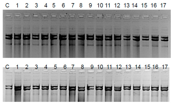 The Fpg protein digestion of plasmids isolated from both control and cultures treated with peptidomimetics, regardless of the length of the alkyl chain, clearly showed no visible damage in the mutual changes of covalently closed circle (ccc), linear, and open circle (oc) forms, as well as in fuzzy bands known as the “smear” (Figure 5). In the case of plasmids from strains K12 and R4, three traditional forms were observed: very poor form oc, linear, and ccc. We did not observe important differences between the control and plasmids modified by peptidomimetics in the electrophoretic images (Figure 5).