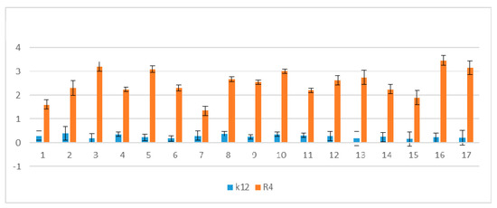 MIC values for individual strains of E. coli R1–R4 and K12 were visible on all analyzed microplates after the addition of the indicator microbial growth (resazurin). On the first plate, strains K12, R1, R2, and R3 were sequentially added together with another three compounds, i.e., coumarinacid 1, ethyl ester of coumarin acid 2, and peptidomimetic 3 without a coumarin group. Here, a color change was observed already at a dilution of 10−3 and a MIC value of 0.02 mg∙mL−1. On the second plate, strains K12, R1, R2, and R3 were sequentially added together with another three peptidomimetic compounds marked 11, 12, and 13. Here, a color change was observed already at a dilution of 10−4 and a MIC value of 0.002 mg∙mL−1. On the third plate, strains K12, R1, R2, and R3 were sequentially added together with the next three peptidomimetic compounds designated as 5, 15, and 6. Here, a color change was observed for compound 5 only at a dilution of 10−5 corresponding to the MIC value of 0.002 mg∙mL−1. However, changes in the color in the wells after using peptidomimetics 5, 6, and 15 were visible at a dilution of 10−3, corresponding to an MIC value equal to 0.02 mg∙mL−1. On the fourth plate, strains K12, R1, R2, and R3 were sequentially added together with three peptidomimetics marked as 9, 4, and 3. Here, a color change was observed in strain K12 for all three analyzed compounds at a dilution of 10−3 corresponding to an MIC equal to 0.02 mg∙mL−1. In contrast, for the other R1–R3 cavities, color changes in the wells after using peptidomimetics 9, 4, and 3 were visible at a dilution of 10−4, corresponding to an MIC value of 0.002 mg∙mL−1. On the fifth plate, strains K12, R1, R2, and R3 were sequentially added together with the three peptidomimetics designated as 7 and 16. Here, in all strains, a color change in the wells was observed for the analyzed compounds even at a dilution of 10 corresponding, to an MIC value of 0.002 mg∙mL−1. On the sixth plate, strains K12, R1, R2, and R3 were sequentially added together with three peptidomimetic compounds marked 2, 14, and 17. Here, in all strains, a color change in the wells was observed for the analyzed compounds at a dilution of 10−2, corresponding to an MIC equal to 0.2 mg∙mL−1. On the seventh and eighth plates, only the R4 strain was applied together with further peptidomimetic compounds (coumarin derivatives) determined from 1 to 17. In all analyzed wells with the R4 strain, a color change was observed for the tested compounds from 1 to 12 already at a dilution of 10−4, corresponding to an MIC value of 0.002 mg∙mL−1. In the eighth plate, where compounds 13 to 17 were analyzed, the color change was visible already at a dilution of 10−3, corresponding to an MIC value equal to 0.02 mg∙mL−1. Mutual interactions between the analyzed compounds and strains on the basis of plaque analysis are presented in Figure 2.