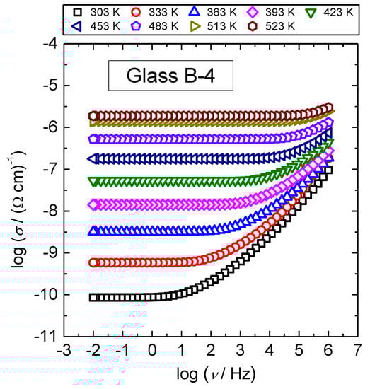 Normally, each isotherm exhibits two features, a plateau at lower frequencies that corresponds to the DC conductivity and dispersion at higher ones. The dispersive behavior is more evident at lower temperatures and frequencies, and shifts to higher frequencies with temperature. In Figure 1, the conductivity dispersion for B-4 glass is visible for temperatures up to 483 K. Further, it can be seen that DC conductivity is thermally activated whereas conductivity dispersion shows a weak temperature dependence. In the following, we present in detail the analysis of both quantities in terms of their temperature and compositional dependence.