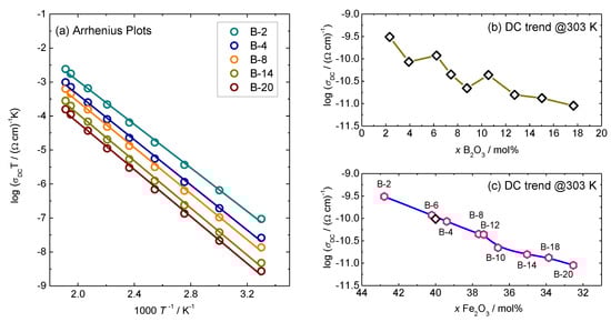 (a). Temperature dependence of DC conductivity (log(σDCT) vs. 1/T) for selected glasses from xB2O3–(100 − x)[40Fe2O3–60P2O5] series and (b,c) DC-conductivity at 303 K as a function of B2O3 and Fe2O3 content, respectively, for glasses from xB2O3–(100 − x)[40Fe2O3–60P2O5] series. Solid lines in (a) represent the least-square linear fits to experimental data, whereas lines in (b,c) are drawn as guides for the eye. Black open diamond symbol in (c) is the experimental data for 40Fe2O3-60P2O5 glass reported in [30].
