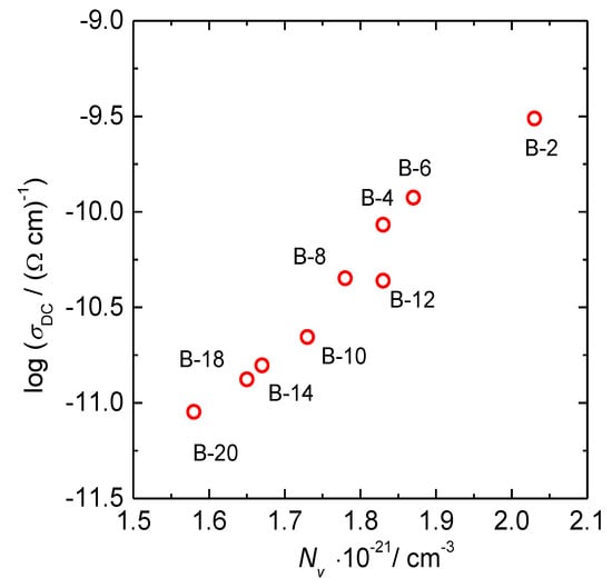 The dependence of DC conductivity of glasses upon B2O3 and Fe2O3 content is shown in Figure 2b,c. The DC conductivity decreases perfectly linearly for almost two orders of magnitude with decreasing Fe2O3 content, whereas it shows a scattered decrease with a simultaneous increase in B2O3. Observed trends suggest that the dominant parameter for the polaronic transport in these glasses is Fe2O3 content and not the addition of B2O3. Interestingly, the DC conductivity of binary 40Fe2O3-60P2O5 mol.% glass without B2O3 which we previously reported [30] lies precisely on the linear dependence of DC conductivity versus Fe2O3 content of the present glass system, see the black symbol in Figure 2c. This further supports our conclusion that the polaronic transport in these glasses is controlled solely by the iron oxide content and hence, polaron number density. Here, it should be noted that the polaron number density depends not only on the total amount of Fe2O3, but also on the fraction of Fe2+ and Fe3+ ions. For the Fe2+/Fetot ratio ≤ 0.5 the polaron number density is determined by the product of number density of the total iron ions and fraction of ferrous ions, whereas for Fe2+/Fetot ratio > 0.5 it is determined as a product of the number density of the total iron ions and the fraction of ferric ions [3,4,30]. In the previous structural study of this glass system [24], it was shown that there is no significant variation in Fe2+/Fetot ratio since the fraction of ferrous ions for selected glasses changes from 0.16 to 0.22. Therefore, we can approximate Fe2+/Fetot ratio to be constant throughout the entire series, which allows us to assume that the polaron number density is proportional to the overall Fe2O3 content. The values of polaron number density calculated using the average value of Fe2+/Fetot = 0.19 for all glasses are given in Table 3. For example, the polaron number density, Nv (polarons), for B-2 glass is calculated by multiplying number density of the total iron ions, N (Fe ions), see Table 3, and 0.19 (10.7 × 1021 cm−3 × 0.19 = 2.03 × 1021 cm−3). Indeed, the DC conductivity exhibits a similarly linear increase with increasing polaron number density, see Figure 3.