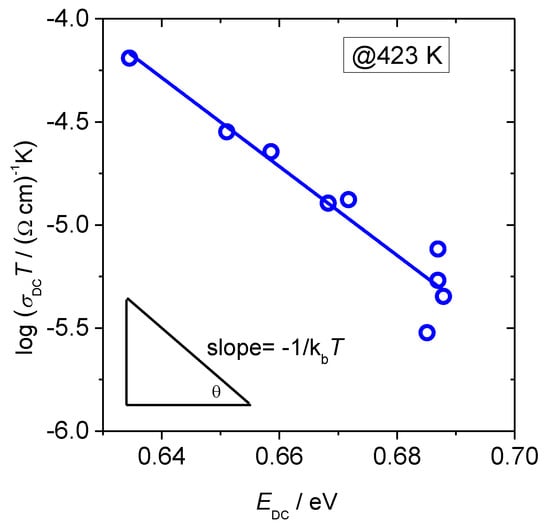Going further in the analysis of the polaronic transport in these glasses we turn our attention to the changes in the pre-exponential factor and parameters it contains, see Table 2. According to Austin–Mott`s theory of small polaron hopping, the conduction process can be characterized by either adiabatic or non-adiabatic hopping. In adiabatic hopping, the electron is at all times relaxed in the potential well of its lattice distortion and hence can respond rapidly to the displacement of the lattice due to the polarization field, while in non-adiabatic hopping the chance of the electron tunneling is rather small [1,2,5]. Hence, in adiabatic hopping conduction, the tunneling term exp(−2αR) in Equation (2) is approximately 1, thus αR becomes negligible. Although in literature there has been much discussion about whether adiabatic or non-adiabatic hopping picture is valid for oxide glasses at high temperatures [3,4], it was shown from DC conductivity data that non-adiabatic hopping model is more suited to describe polaron transport in iron phosphate-based glasses [27]. In order to check the adiabatic or non-adiabatic nature of the hopping conduction in glasses from this study, we have analyzed the dependence of log(σDCT) vs. activation energy, EDC at a fixed experimental temperature T = 423 K, see Figure 4. In such a plot, the slope equals to 1⁄kBT which enables us to determine the mechanism of the polaron hopping in the following way. If the experimental temperature is approximately equal to the temperature obtained from the slope, the process is adiabatic. On the other hand, if the temperatures differ, the process is non-adiabatic.
