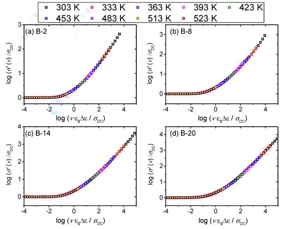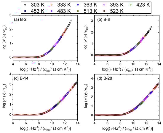 For all glasses in this study, Summerfield scaling procedure yields a perfect master-curve demonstrating that the time–temperature superposition (TTS) is valid and that the conductivity mechanism is temperature-invariant, as shown for B-2, B-8, B-14 and B-20 glasses in Figure 5. This is in line with the scaling properties of various oxide glasses that exhibit ionic [36,37] or polaronic conductivity [30,37]. Interestingly, our previous study on xB2O3–(40–x)–Fe2O3–60P2O5 (x = 0–20, mol.%) system showed that glass with 2 mol.% of B2O3 fails to produce a master-curve when Summerfield scaling procedure is applied [27]. The cause of this deviation was found to be related to the influence of structure on the polaronic conductivity, i.e., local structural disorder induced by the addition of a small amount of B2O3 which allows changes of the number density of polarons and/or their pathways with temperature.
