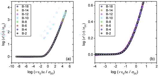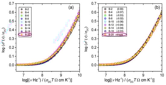 In the glass system studied in this work, we have not observed the same effect and glasses with small amounts of B2O3 obey Summerfield scaling (cf. with Figure 5 for B-2 glass). This result can be related to the fact that within this glass series, B2O3 is added at the expense of both Fe2O3 and P2O5 which has a different influence on the cross-linking of the iron phosphate network. Previous structural study of these two glass systems [24] shows that a gradual substitution of Fe2O3 and P2O5 by B2O3 weakens the network structure as evidenced by the decrease in Tg, whereas an opposite trend is observed for glasses where only Fe2O3 was replaced by B2O3. For this reason, it seems likely that at low amounts of B2O3, small changes in the strength and rigidity of the iron phosphate network affect the mechanism of polaronic transport, i.e., by enabling or disabling the temperature dependence of polaron number density and/or conduction pathways. Furthermore, it is interesting to explore the influence of the glass composition and structure on the conductivity dispersion by applying super-scaling in which all individual master-curves within the glass series are superimposed onto each other. Figure 6a,b shows the result of such super-scaling for all investigated glasses. As can be seen from the Figure 6a individual master-curves do not accurately overlap and a super-master curve could not be obtained. There are two possible reasons for such a result: either the shape of the conductivity dispersion changes or/and individual master curves get shifted along the x-axis with the changes in the glass composition.