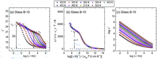 The spectra of the real part of permittivity, ε′ (ν), at different temperatures for B-10 glass is shown in Figure 7a as a representative for all other glasses in this study. At each temperature, permittivity spectrum exhibits a typical frequency-dependence; at higher frequencies, the real part of the permittivity tends to a constant value, ε′∞, which results from rapid polarization processes occurring in the glasses under an applied field whereas, with decreasing frequency, it increases and approaches a limiting low frequency plateau denoted as the low-frequency static permittivity, ε′s. The static permittivity is associated with the polarization effects of the polarons with respect to the immobile glass matrix and determines the difference Δε = ε′s−ε′∞ called dielectric strength of relaxation [40,41].
