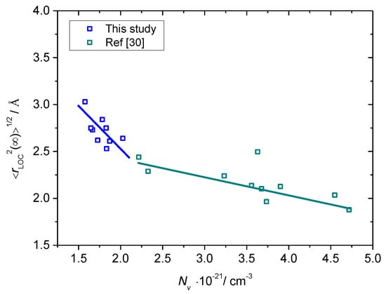 As can be seen from Table 3 and Figure 8, the value of < rLOC2(∞)>1/2 increases from 2.53 Å to 3.03 Å as the polaron number density, Nv, decreases from 2.03 × 1021 cm−3 to 1.58 × 1021 cm−3 for B-20 glass. Such a trend corroborates our previous findings [30] that the spatial extent of the localized polaron hopping decreases with increasing polaron number density and represents a realistic estimate of the extent of polaron cavity. Indeed, from Table 3 it is visible that the magnitude of the <rLOC2(∞)>1/2 values is close to that of polaron radius, rp, calculated from the equation proposed by Bogomolov and Mirilin: rp = (1/2) (π/6N)1/3 where N is the total number of iron ions [44,45]. Also, it should be noted that the values of < rLOC2(∞)>1/2 for these glasses are higher than those obtained for glasses from xHfO2-(40−x)Fe2O3-60P2O5, 0 ≤ x ≤ 8 mol.%, xCeO2-(40−x)Fe2O3-60P2O5, 0 ≤ x ≤ 8 mol.% and xHfO2-(38−x)Fe2O3-2B2O3-60P2O5 2 ≤ x ≤ 6 mol.% series [30]. This result is in line with their lower values of polaron number density, compare Table 3 and Table 3 in [30]. However, it is interesting to see that the decrease of < rLOC2(∞)>1/2 with Nv for the present glass system is characterized by a larger slope than that of HfO2-Fe2O3-P2O5, CeO2-Fe2O3-P2O5 and HfO2-Fe2O3-B2O3-P2O5 glasses [30], see Figure 8. This observation can be related either to the influence of borate units on the formation of polarons or to the inherent property of the polaronic transport in iron phosphate glasses with low Nv. In order to ascertain the actual cause of this behavior, more investigations on the iron phosphate glasses with a similar range of polaron number density but free of B2O3 are required. These studies are underway.