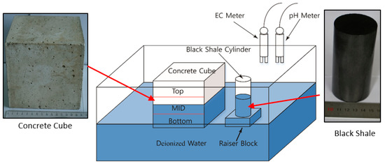 To evaluate the effect of the acidic discharge produced by black shale on the concrete, laboratory black shale-concrete immersion tests were set up to mimic in situ conditions. In this study, the cylindrical black shale specimens were partially immersed in deionized (DI) water at different immersion heights (30 mm and 50 mm or 30% and 50% immersed), which was designed to simulate the water-rock interactions under partially saturated conditions (Figure 1). The black shale specimens were immersed in a 300 mm (length) × 200 mm (width) × 200 mm (height) mm acrylic tank with DI water filled to 75 mm. The original pH and electrical conductivity (EC) of the DI water were 7.1 and 1.8 mS/m. The top of the tank was vented to the air, and the tests were controlled at a room temperature of 20 ± 1 °C and relative humidity of 30%. An acrylic raiser block was used to control the immersion depths of the black shale to be either 30 or 50 mm.