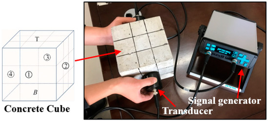 The setup of the ultrasonic speed test. The different surfaces of concrete are denoted as ①, ②, ③, ④, T, and B. T and B represent the top and bottom surfaces. Each surface of the concrete was marked into 3 × 3 partitions and then measured with the ultrasonic test equipment.
