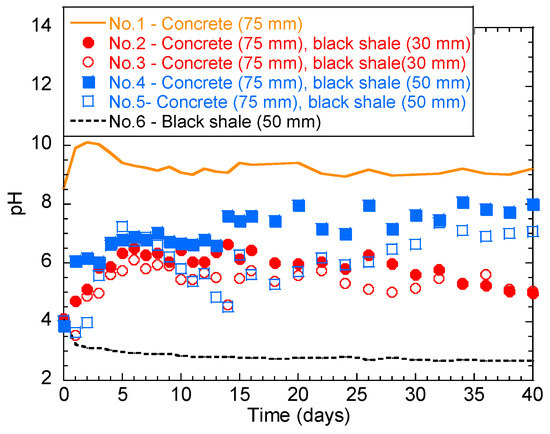 The temporal behavior of the solution pH in the laboratory immersion test is shown in Figure 3. Generally, concrete and black shale created alkaline (Figure 3 solid line) and acidic environments (Figure 3 dashed line), respectively. The pH of group No.1 (only concrete) was alkaline from 8.6 to 10.0 for the first 3 days, indicating the dissolution of the alkaline phase into the solution. The pH then slightly decreased and stabilized in the range of 9.0–9.5 after 5 days. The pH of No.6 (black shale only) showed a pH range of 2.5–4.0, indicating the oxidation of sulphide minerals and the generation of acid.