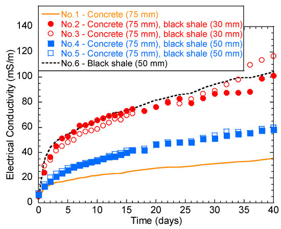 The temporal behavior of solution EC is shown in Figure 4. Generally, the EC of the solution increased rapidly over the first 2 days. The increase rate then slowed down until the 40th day. Tests No.2, 3, and 6 had the highest final EC (101.3–118.6 mS/m), indicating a stronger ionic concentration in the immersion solution than the other groups. In particular, the higher water EC of No.6 (black shale only) was majorly contributed to Fe (115.2 mg/L) and SO42− (1022.9 mg/L), which are the major oxidation products of pyrite (Table 2). Additionally, the color of all the immersed solutions turned yellow after immersion, except for group No.1, indicating the presence of ferric ion (Fe3+) (Figure 5a). The oxidation products were also visible on the surface of the concrete and black shale below the immersion level (Figure 5b). On the contrary, concrete (No.1) showed the lowest EC during the entire testing period, and the final EC on the 40th day was 35.4 mS/m. This result indicated that the concrete was relatively stable during immersion and the dissolution of major constituents from the concrete was relatively slow.