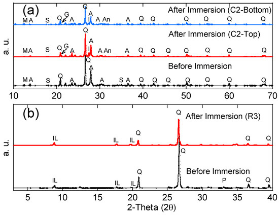 Ultrasonic velocity increases with the density and continuity of the sample. Therefore, in this study, higher ultrasonic velocity revealed a better quality and continuity (less voids) of the concrete. The ultrasonic velocity of each concrete specimen before and after the immersion tests is shown in Figure 6, and average values with the standard deviation are reported. The standard deviation was less than 5% of all average values for all the tests. Before the immersion tests, the ultrasonic velocity of each concrete specimen was in the range of 3.5–3.6 um/mm, indicating that the concrete was uniform. After the immersion tests, the ultrasonic velocity of the top and middle layers had increased (from 3.7 to 4.1 um/mm), indicating the enhancement of the concrete quality (less voids) in these layers. This phenomenon is likely due to two mechanisms: (1) For the non-immersed (top) layer, since all testing groups had no contact with acid water, but increased ultrasonic velocity, the reason is most likely due to the additional hydration from capillary suction, which enhanced the strength of the concrete (e.g., C1 group without black shale); (2) for the partially immersed (middle) layer, since only groups with black shale presented increases in ultrasonic velocity, the precipitation generated in the capillary zone may have filled the voids of the concrete and increased the density and continuity of the material. The latter mechanism was further proved by the mineralogy analysis using XRD. The minerals of concrete before and after the immersion are reported in Figure 7a, and representative concrete specimens, i.e., C2 and C4, were selected and reported. The results show that goethite, iron sulfate hydroxide (Fe(OH)SO4), and anhydrite (CaSO4) appeared in the mineral phase after the immersion, indicating the precipitation of these minerals in the void spaces of the concrete. The precipitation occurred in both the immersed and non-immersed zones, showing that the capillary zone may have a strong effect on the mass transfer under partially immersed conditions.