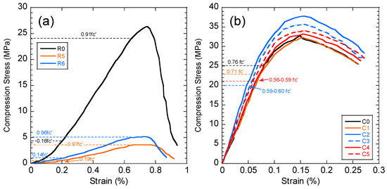 Stress-strain curve of (a) black shale and (b) concrete specimens after the immersion tests. C0 and R0 denote the concrete and black shale specimens before the immersion tests.