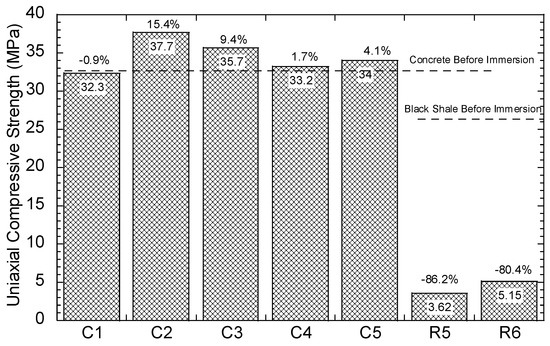 The compressive strength of the concrete and black shale samples was examined before and after the immersion tests. Black shale specimens from R2, R3, and R4 could not be obtained due to the inordinate fractures and cracks. Therefore, only the relatively integrated black shale specimens (R5 and R6) and concrete specimens were tested in this study. The strains to reach the maximum compressive strength (fc’) were similar before (0.7%) and after (0.6%) the immersion, and the elastic ranges of the black shale were also identical for all immersion conditions (Figure 8a). The elastic range of the black shale generally appeared between the strain of 0.2% (at 0.14–0.16fc’) to 0.6% (at 0.91–0.97fc’). Destruction of the black shale specimens (R5 and R6) was observed after the immersion test. The maximum compressive strength of R5 and R6 decreased by 80.4–86.2% compared to that of the black shale before the immersion test (R0), which indicates that a strong weathering and dissolution occurred in the black shale (Figure 9). Additionally, the mineralogy analysis by XRD proved that the dissolution of minerals during the immersion tests, especially the pyrite peak, disappeared after the immersion period (Figure 7b). The dissolution of minerals also affected the strain-stress behavior of the black shale. The elastic modulus decreased dramatically from 4.5 GPa to 0.7 GPa, indicating a significant loss of stiffness in the black shale specimens.