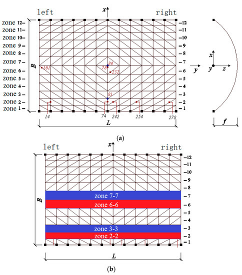 Based on the aforementioned analysis method, a single-layer monoclinic cylindrical reticulated dome with a span of 20 m, 30 m in length and 7.5 m in height was modeled using the general-purpose program Abaqus (Figure 1). The dome was supported with pins along the two longitudinal edges, with bottom nodes hinged to the ground. All the structural members are Chinese steel tubular sections, where, the lateral and diagonal members are Chinese Ø166 × 5, and the longitudinal member are Chinese Ø114 × 5. The grade of the steel is Chinese Q235-B), with an initial yield stress of 235 MPa. Von Mises theory is adopted as yield criteria. The Young’s modulus was 2.06 × 105 MPa. The Poisson ratio was 0.3. The live load of the roof was taken as 2.5 KN/m2. Figure 1 also shows the structural zone divided by the authors, which is shown to clearly demonstrate the response of the dome under earthquake loading.