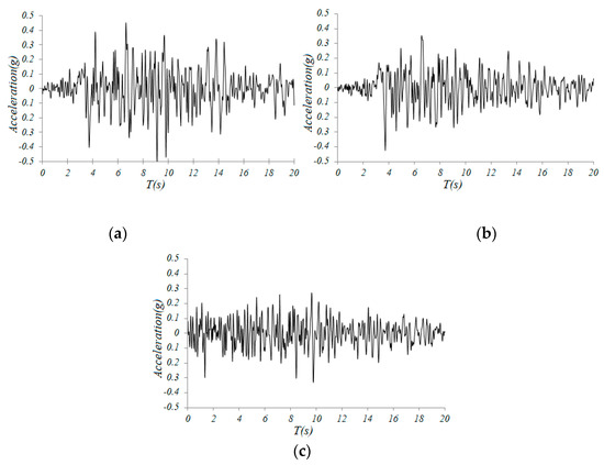 Amplified Taft earthquake wave: (a) X direction, (b) Y direction, (c) Z direction.