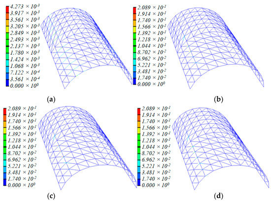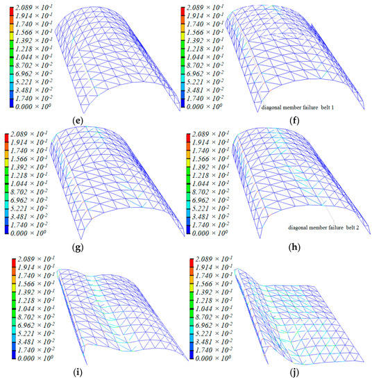 Figure 5 and Figure 6 depict the deformation and distribution of the damage of the structural member during the collapse process for the other two domes, with span:depth ratios of 4:1 and 2:1, respectively. Their spans are kept at 20 m. Figure 7 and Figure 8, respectively, depict the other two 20-m-span domes, one with a length:width ratio of 1:1, another with a ratio of 2:1. With the increase in the length:width ratio, the position of the “diagonal member failure belt” moved from zones 2-2/6-6 to 3-3/7-7. The decrease in the length:width ratio caused a contrasting trend. With the exception of the above, the basic process of collapse and final collapse forms are similar.