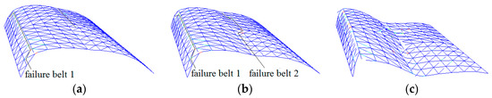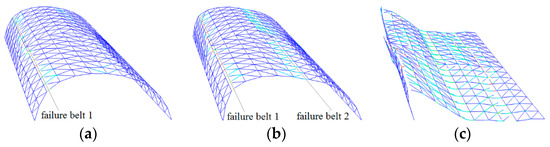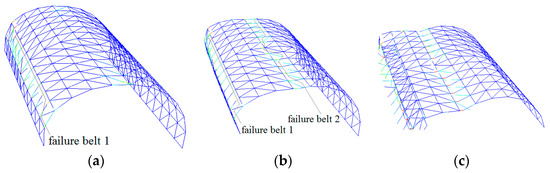 Collapse process of cylindrical reticulated domes of different span/depth ratios at typical times (span/depth = 4:1): (a) belt 1 formed, (b) belt 2 formed, (c) dome collapses.