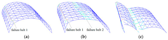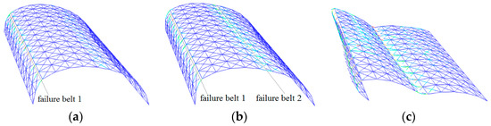 Collapse process of cylindrical reticulated domes of different length/width ratios at typical times (length/width = 2:1): (a) belt 1 formed, (b) belt 2 formed, (c) dome collapses.