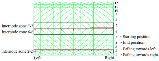 Therefore, continuously increasing the internal force induced by ground motion resulted in severe damage to the diagonal bars 0.8 s later when entering the second stage, because the internal forces of the bars at two ends were larger than that of the bars in the middle; the bars at the ends of the nodes of zone 6-6 failed first (Figure 4g). Then, the other bars failed successively from both ends to the middle in a short time. Finally, at 15.83 s, the second belt was formed.