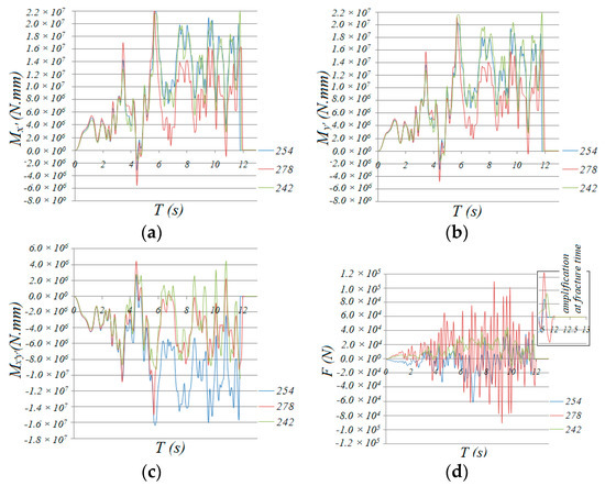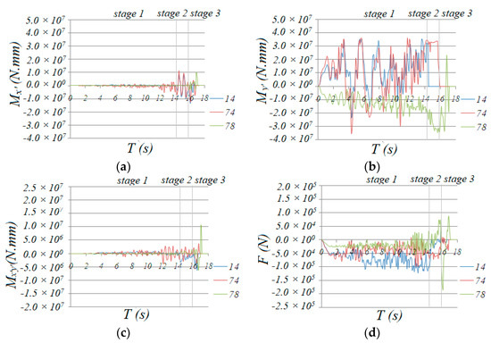 Time history of internal forces of traverse bar 14, 78 and 74: (a) Mx’, (b) My’, (c) Mx’y’, (d) F.