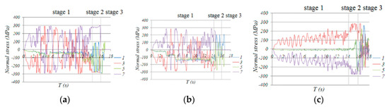 Time history of normal stress in fiber 1,3,5,7 of traverse bar 14, 78 and 74: (a) bar 74, (b) bar 14, (c) bar 78.