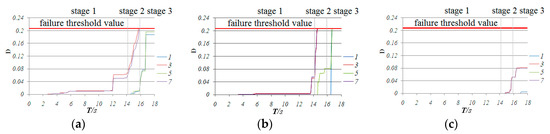 For traverse bar 78 in zone 6-6, although the internal forces of the bar significantly increased because of force redistribution, the damage accumulation mainly developed in upper fiber 3 and lower fiber 7, while fibers 1 and 5 were not damaged seriously. Thus, no bars failed in all fibers. In Figure 14c, the normal stresses in fibers 3 and 7 in bar 78 were very high; we could conclude that this bar acted as a plastic hinge as well.